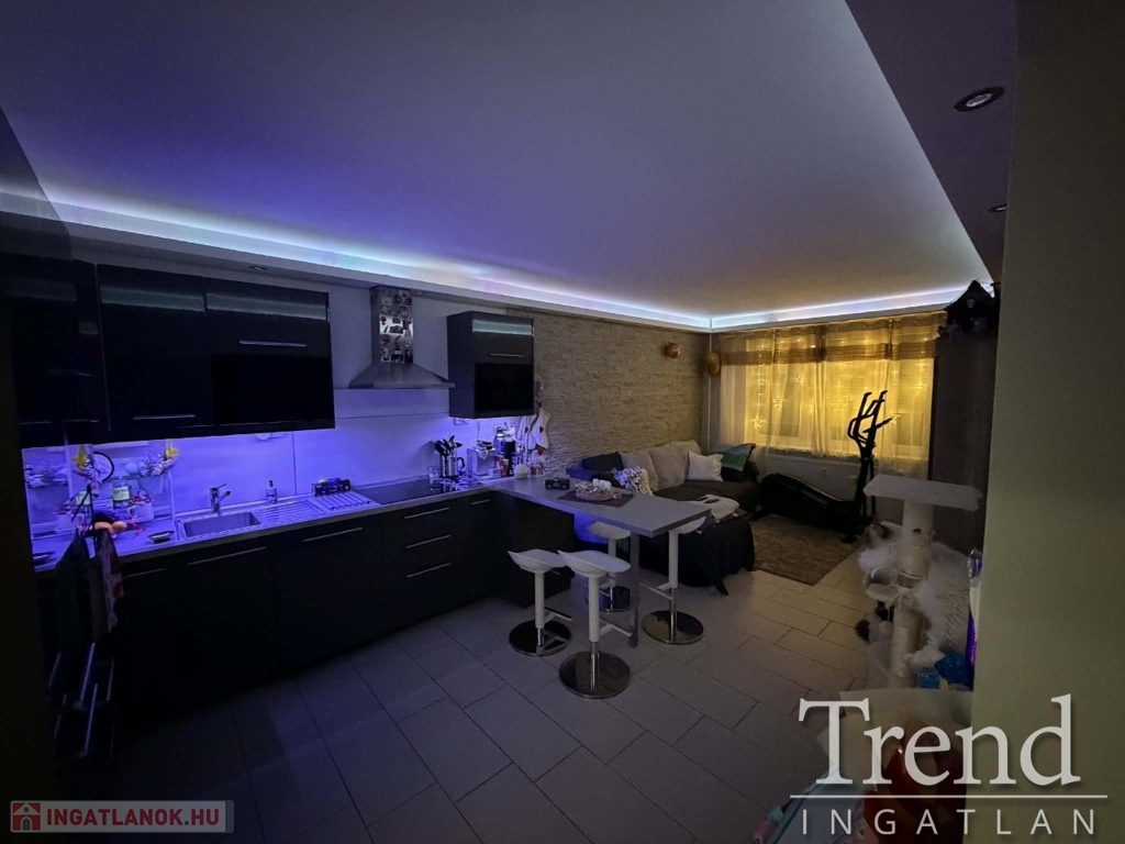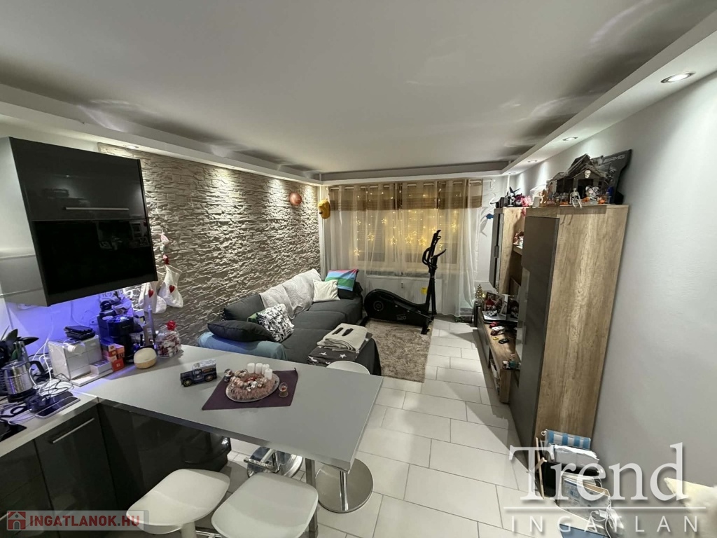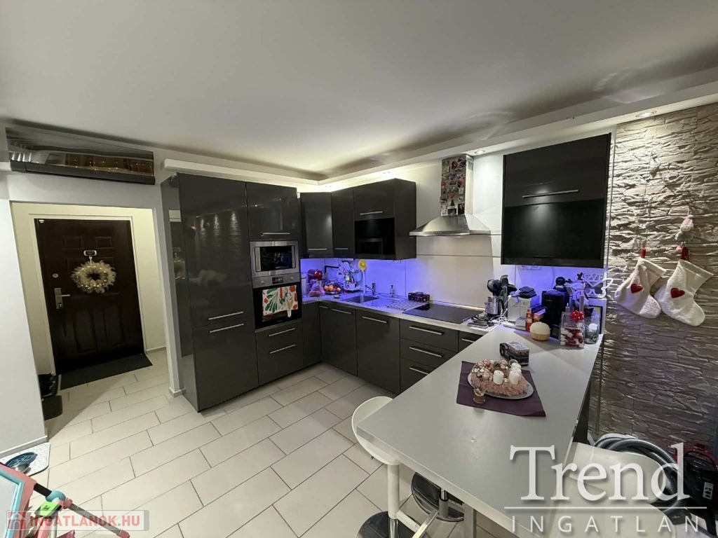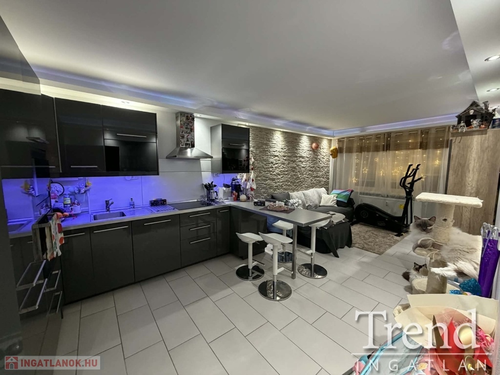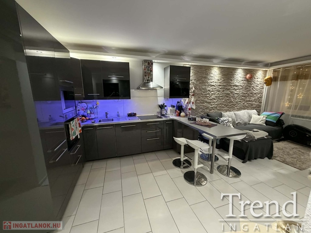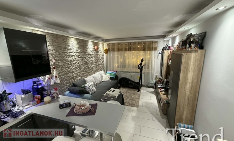 Előszoba, közlekedő, fürdőszoba (félsarokkád), konyha és a nappali járólapozva, a két szoba laminált lapozva. A felújítás során a teljes gépészet (villamos hálózat 32A-re bővítve, vízvezeték), összes nyílászáró, burkolatok, beltéri ajtók, bejárati ajtó cserélve lettek! A konyha, mely az IKEA-ból lett összeállítva a nagy szobában lett kialakítva, mely teljesen felszerelt (elektromos sütő, főzőlap, szagelszívó beépítve). A régi konyha helyére egy kis szoba került kialakításra, melyben egy tolóajtós gardrób is található. A fürdőszoba szintén át lett építve, ennek köszönhetően tágasabb, kényelmesebb lett, egy fél sarokkád került beépítésre. Az előszobából kialakításra került egy tároló, mely gardrób helyiségként és mosókonyhaként funkcionál.